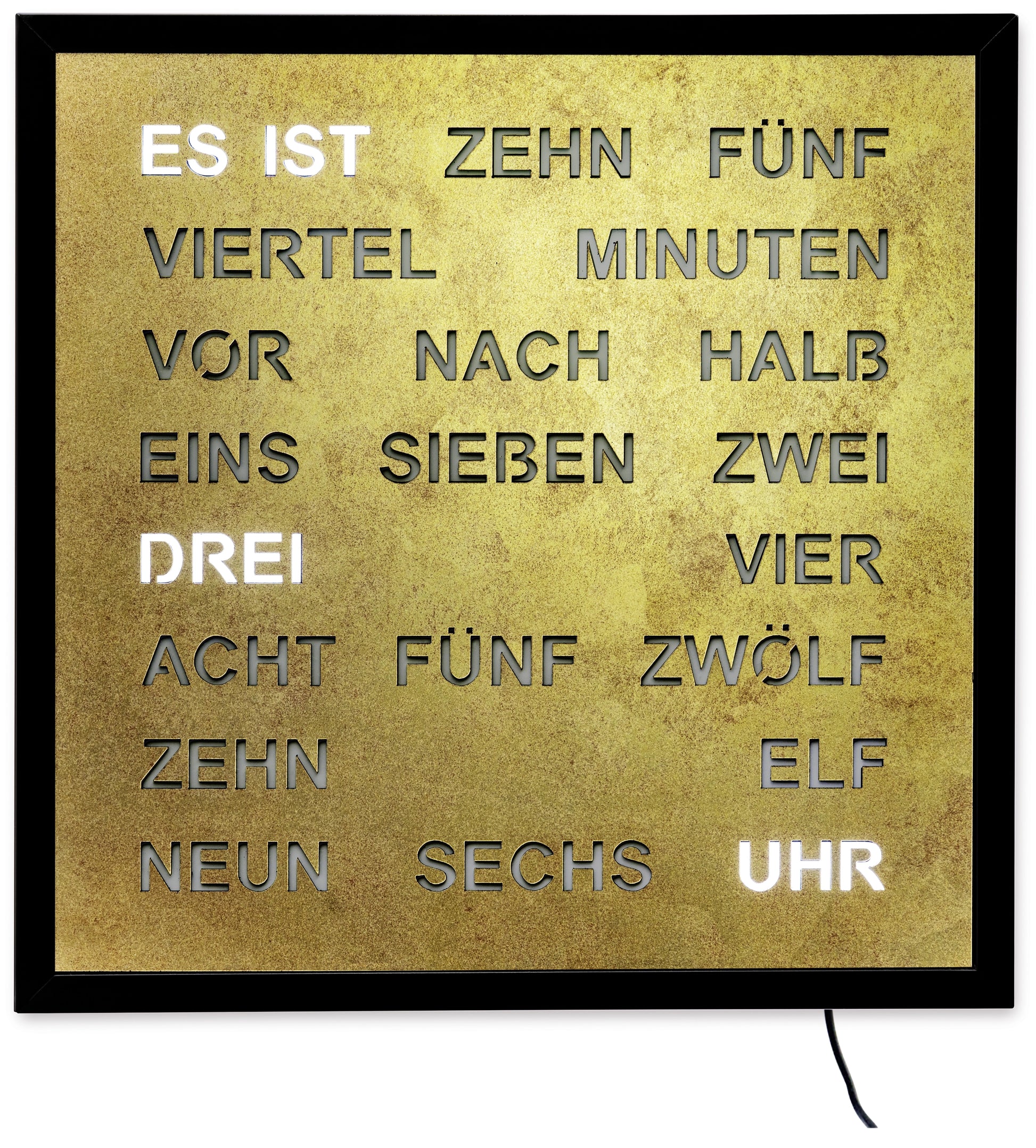- Zifferblatt: Goldfarbene Oberfläche mit integrierter Wortanzeige