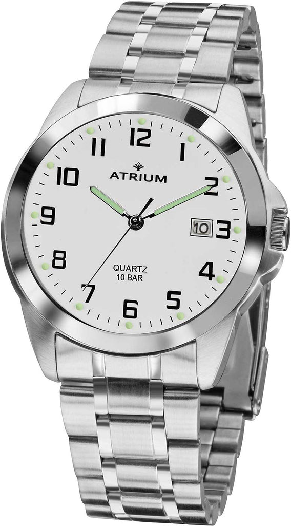 Die klassische Atrium A16-30 Herrenuhr überzeugt durch ihr zeitloses Design und ihre hohe Zuverlässigkeit. Als pflegeleichte Armbanduhr für den Alltag bietet sie dank des kontrastreichen Zifferblatts eine sehr gute Ablesbarkeit, die auch bei schlechten Lichtverhältnissen durch die dezenten Leuchtzeiger unterstützt wird. Das robuste Edelstahlgehäuse und das massive Gliederarmband machen diese Uhr zu einem langlebigen und stilvollen Begleiter.