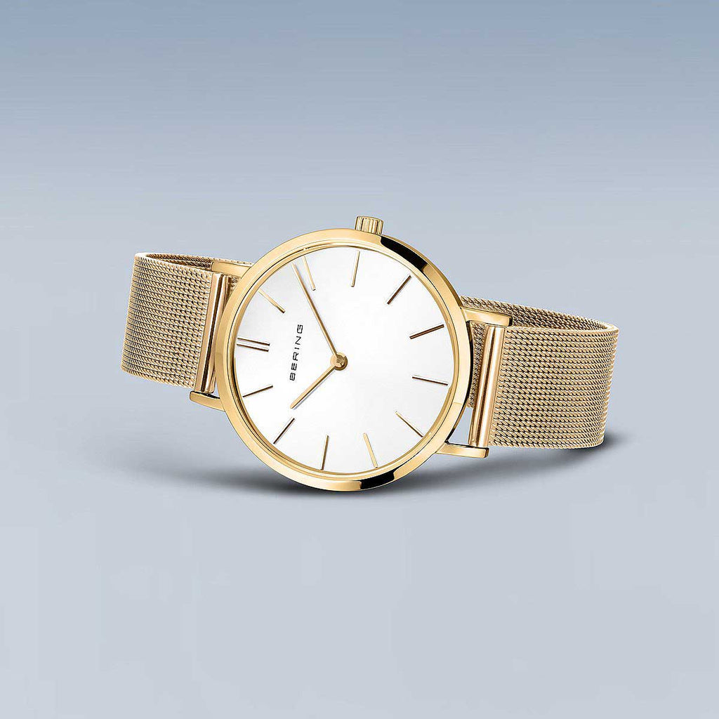 Die Bering Classic 14134-331 Damenuhr besticht durch ihre zeitlose Eleganz und ihr minimalistisches, dänisches Design. Das goldfarbene Gehäuse aus hochwertigem Edelstahl wird durch ein weißes Zifferblatt perfekt ergänzt, was der Armbanduhr eine edle und klare Optik verleiht.
