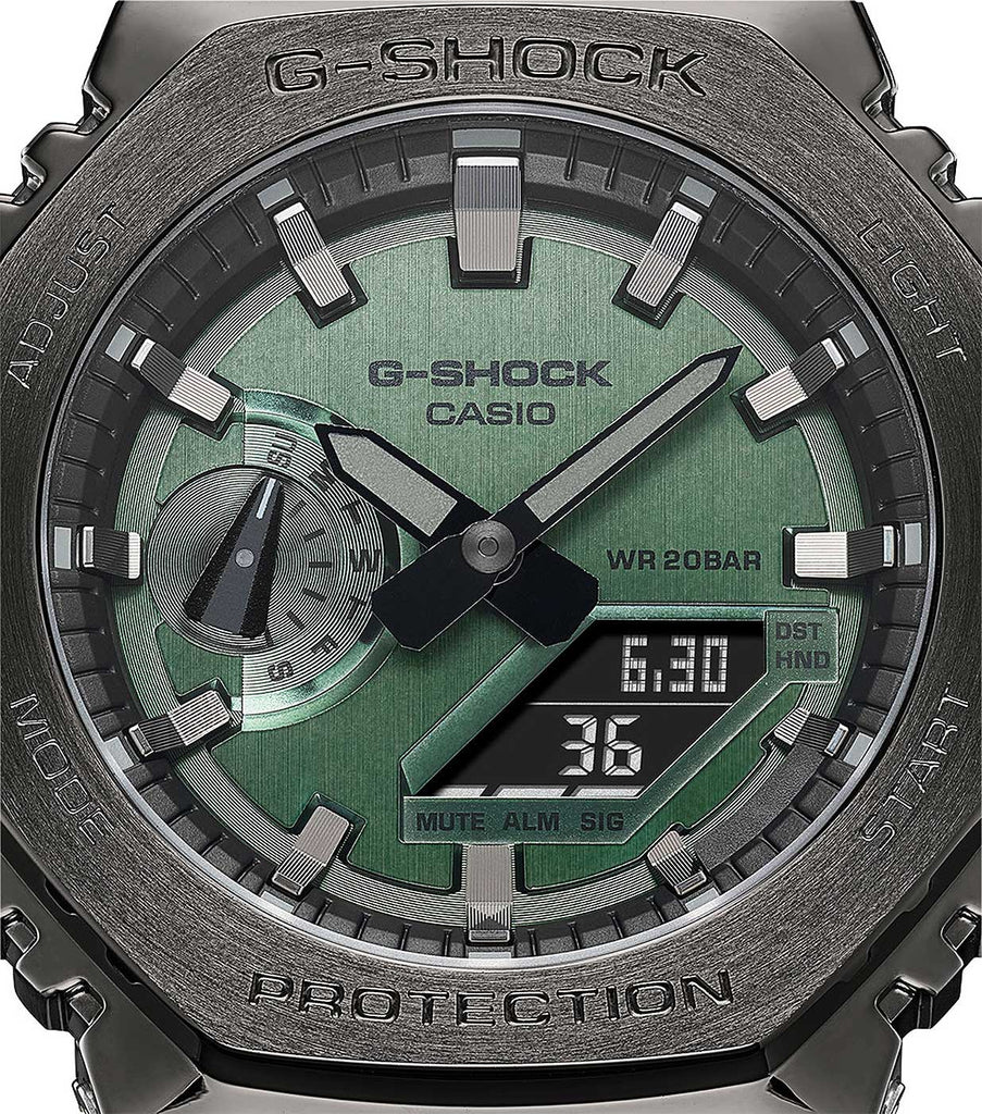 Diese Uhr gehört zur exklusiven Casio G-Shock GM-2100 Serie, die für ihre markanten achteckigen Lünetten und die Kombination aus Metall und Resin bekannt ist.