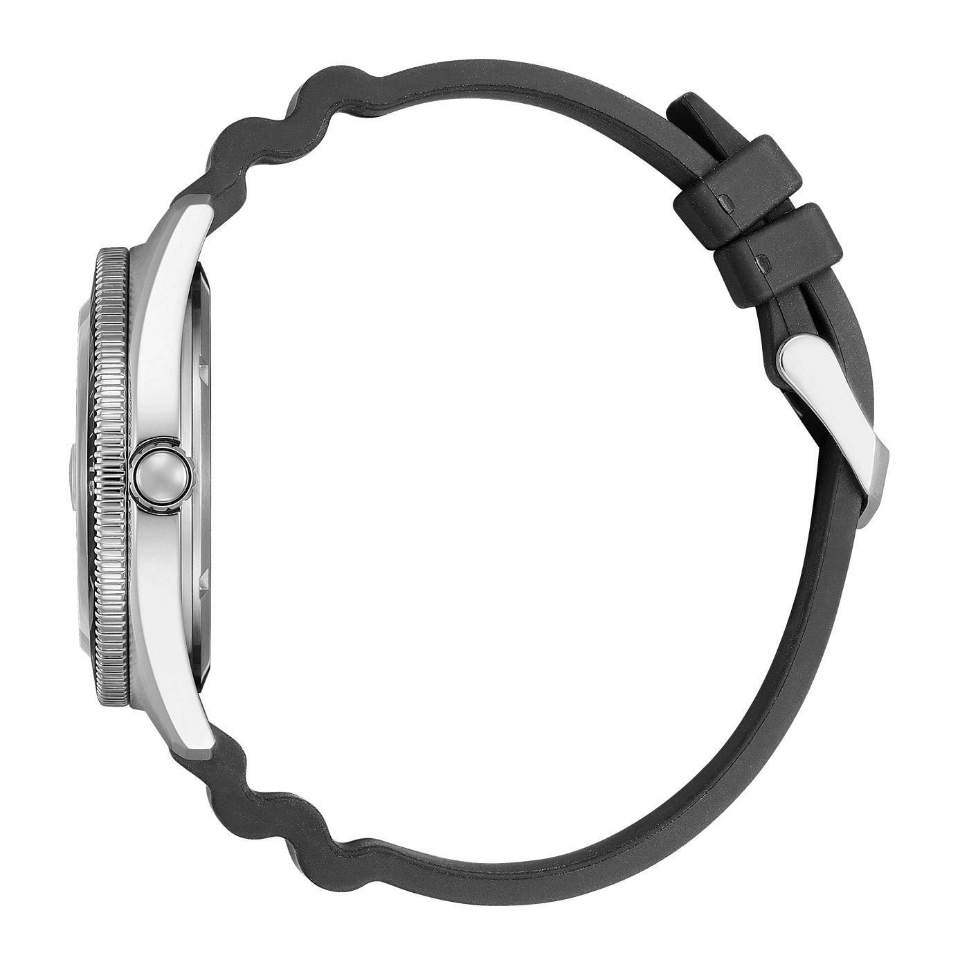 Diese sportliche Herrenuhr besticht durch ein robustes, silberfarbenes Edelstahlgehäuse und ein strapazierfähiges schwarzes Urethan-Armband. Das markante schwarze Zifferblatt verfügt über gut ablesbare arabische Ziffern sowie Punktindizes, während Leuchtzeiger auch bei Dunkelheit für optimale Sichtbarkeit sorgen.