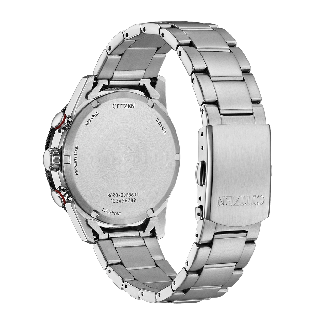 Angetrieben durch die Eco-Drive-Technologie nutzt das Werk Licht als Energiequelle und macht Batteriewechsel dauerhaft überflüssig. Der Chronograph bietet eine 24-Stunden-Anzeige, Datumsfunktion und eine präzise Stoppuhr. Mit einer Wasserdichtigkeit von 10 bar ist das Modell zum Schwimmen geeignet.