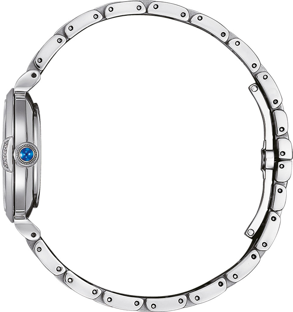 Eco-Drive, Perlmutt-Zifferblatt, 4 Diamanten auf dem Gehäuse, 1 Diamant auf dem Zifferblatt, blaue Krone, Entladungsanzeige, 180 Tage Gangreserve |