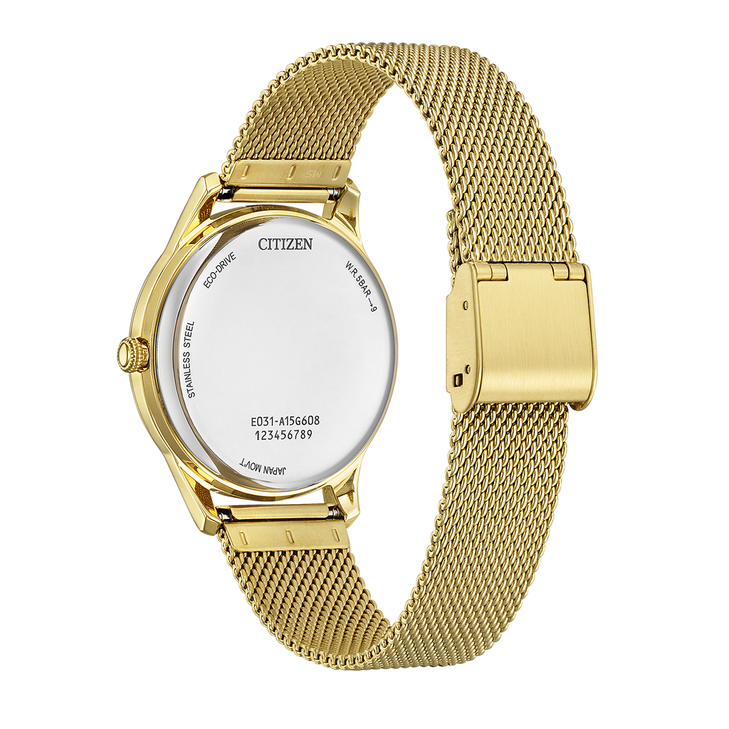 Die Citizen Elegance EM1222-87A ist mehr als nur ein Zeitmesser; sie ist ein Ausdruck von Eleganz und Nachhaltigkeit. Das goldfarbene Edelstahlgehäuse und das passende Milanaise-Armband verleihen ihr eine luxuriöse Ausstrahlung, während die Eco-Drive Funktion für umweltfreundliche Präzision steht.