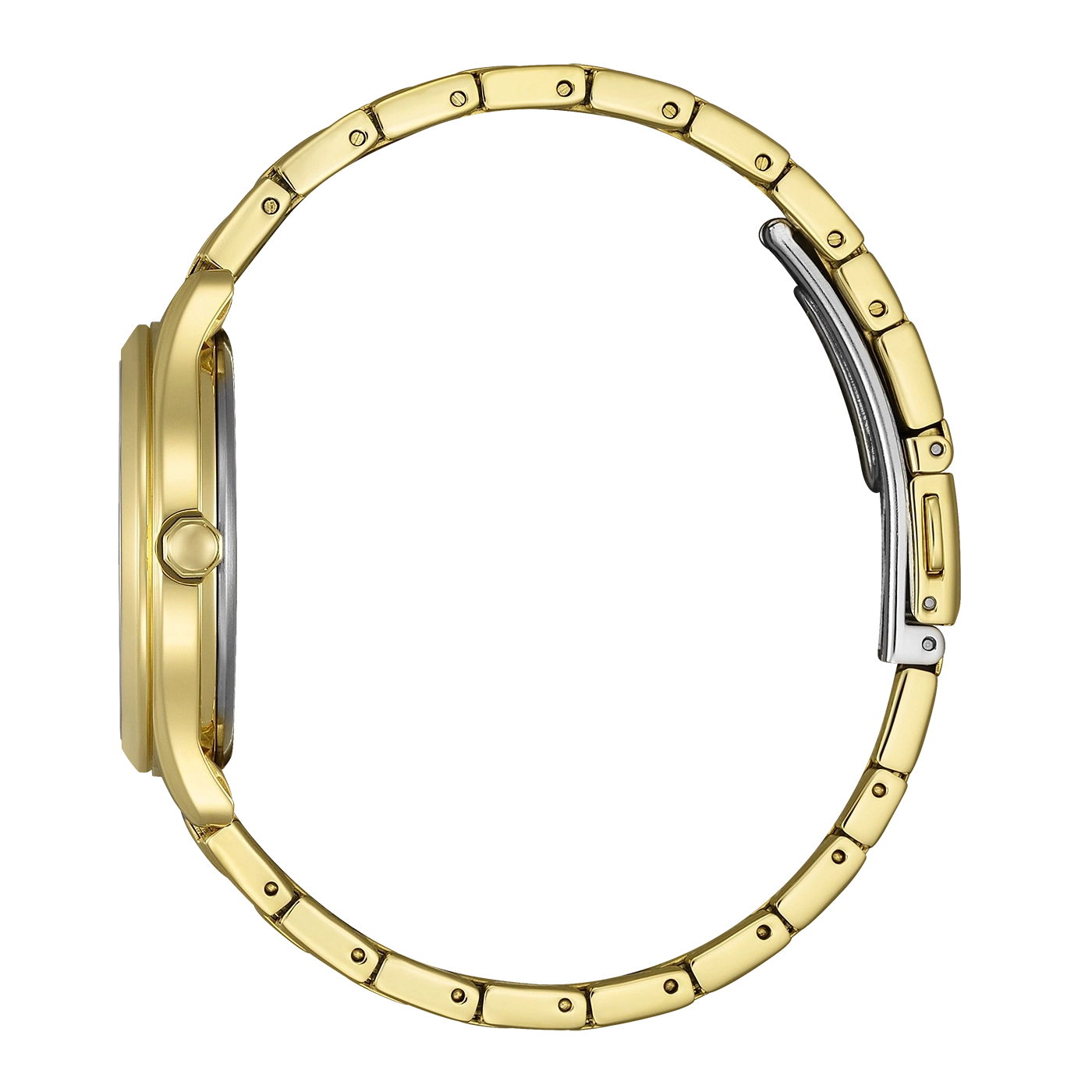 Entdecken Sie die elegante Citizen FE6122-64X Damen Uhr, eine stilvolle Armbanduhr, die sich durch ihren innovativen Eco-Drive Solarantrieb auszeichnet. Diese Damenuhr aus robustem Edelstahl in edlem Goldton, kombiniert mit einem markanten grünen Zifferblatt, ist ein zeitloses Accessoire für jede moderne Frau. Dank der Eco-Drive Technologie gehört der Batteriewechsel der Vergangenheit an, da die Uhr durch jede Art von Licht angetrieben wird.