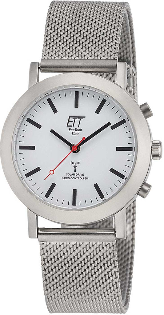 Die Eco Tech Time Solar Drive ELS-11583-11M Damen Uhr vereint zeitloses Design im klassischen Bahnhofsuhr-Stil mit modernster Umwelttechnik. Dank des präzisen Funk-Solarantriebs gehört der lästige Batteriewechsel der Vergangenheit an, während die Uhr durch das DCF 77 Funksignal stets die exakte Uhrzeit anzeigt und sich automatisch auf Sommer- und Winterzeit umstellt.