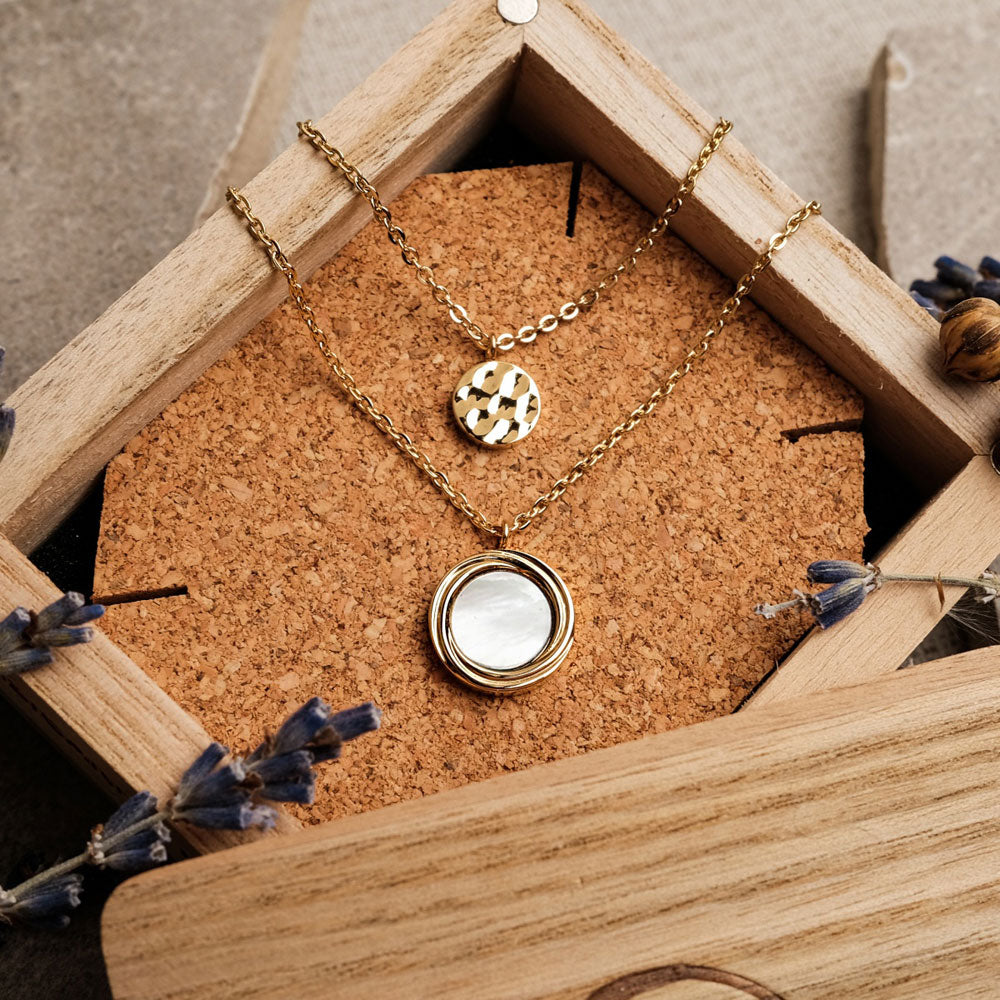 Damen Halskette aus Edelstahl vergoldet mit Perlmutt Anhängern im Layering Look
