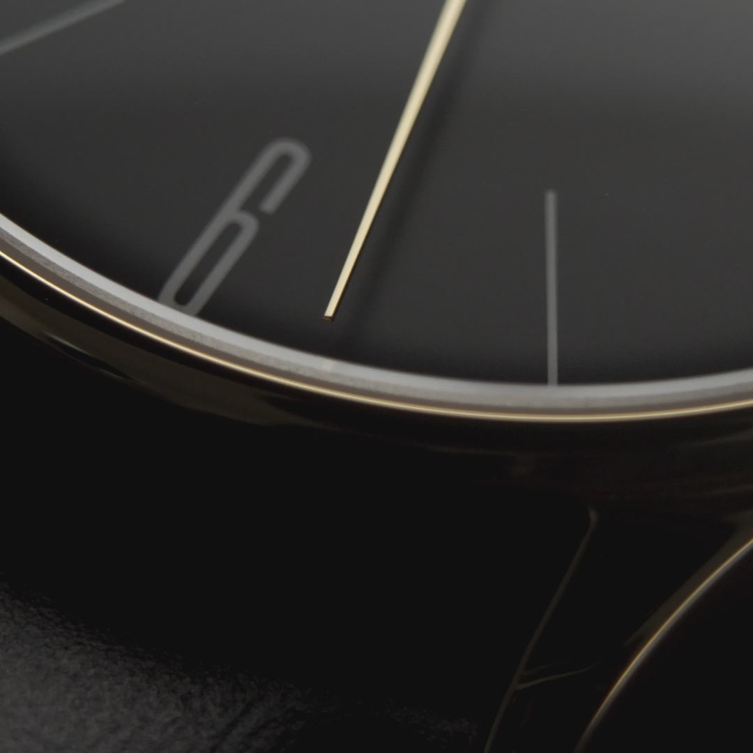 - Schwarzes Zifferblatt mit Strichindex sowie arabischen Ziffern bei 6 und 12 Uhr