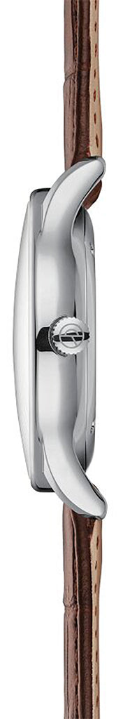 - Silberfarbenes Edelstahlgehäuse mit 38 mm Durchmesser