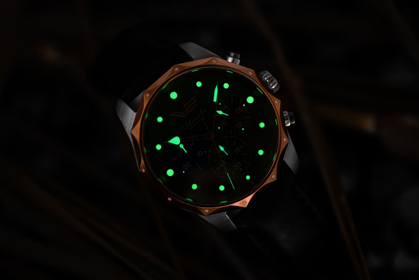Chronograph, 24-Stunden-Anzeige, Leuchtzeiger, Verschraubter Gehäuseboden, Verschraubte Krone |