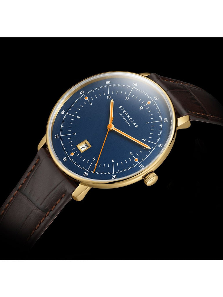 Elegante Herrenuhr Hamburg Quarz Saphirglas Datumsanzeige Dunkelblau Goldfarben Lederarmband - Sternglas Modell: S01-HH07-HE01