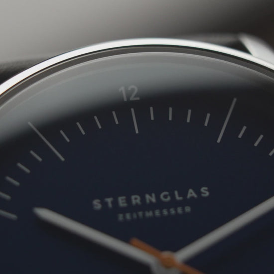 Die Sternglas Automatik überzeugt mit einem 38 mm großen Gehäuse aus poliertem 316L Edelstahl, das eine elegante Basis für das tiefblaue Zifferblatt mit feinem Sonnenschliff bildet. Silberne Zeiger und Strichindizes sorgen für eine klare und kontrastreiche Ablesbarkeit der analogen Zeitanzeige.