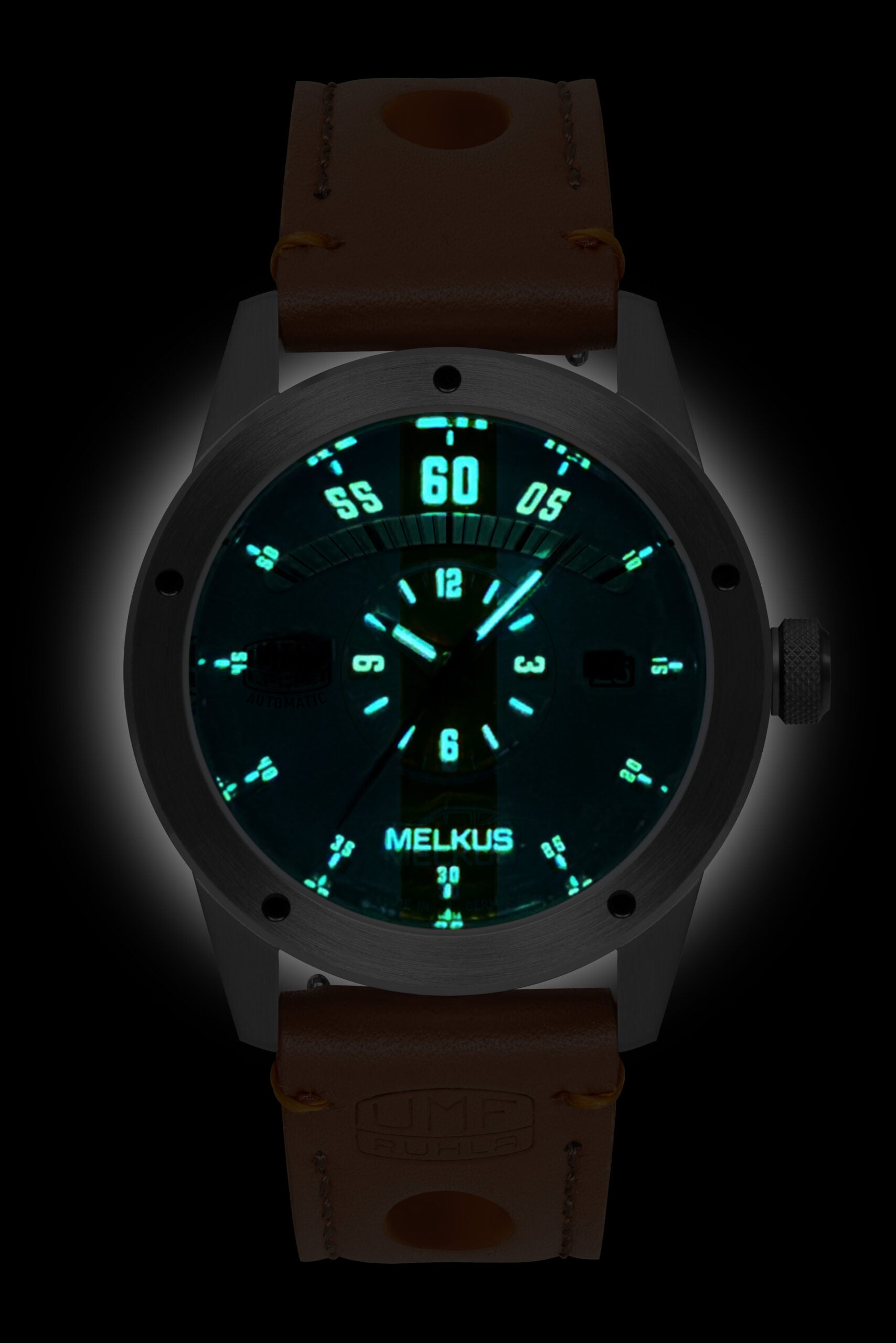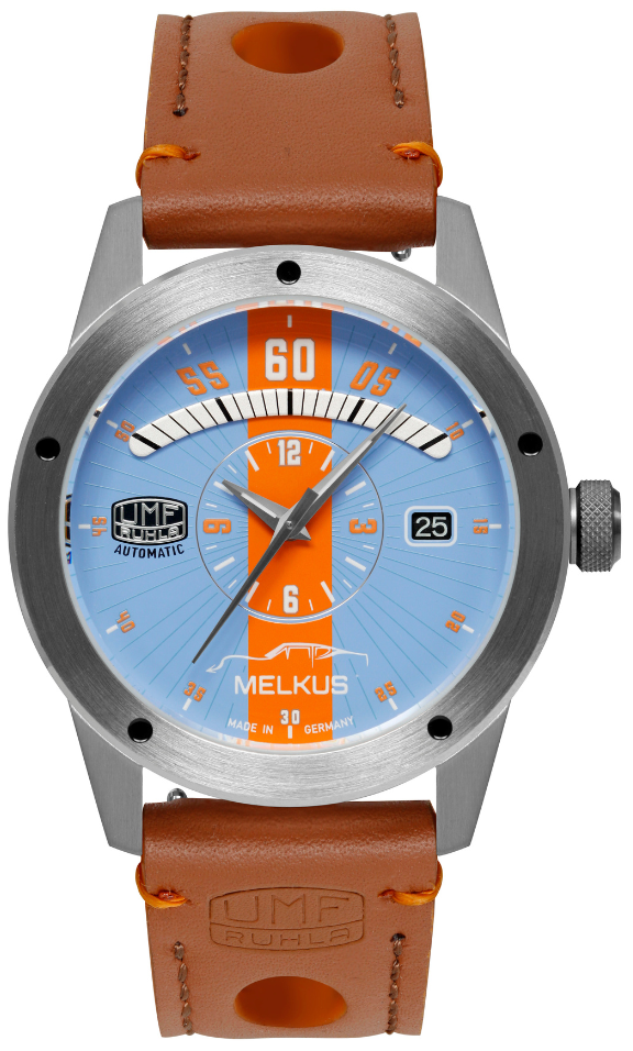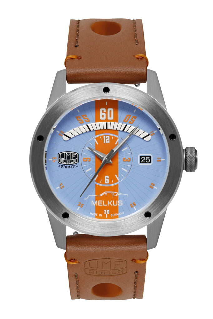 Die UMF RUHLA Melkus 1862-3 vereint deutsche Uhrmacherkunst mit sportlichem Retro-Racing-Design. Das robuste Gehäuse aus silberfarbenem 316L Edelstahl wird durch ein handgefertigtes, braunes Kalbslederband im Racing-Stil ergänzt.