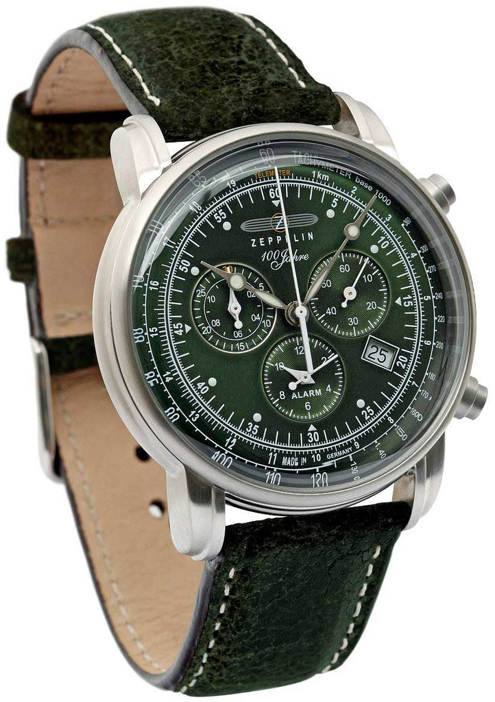 Das glatte, dunkelgrüne Kalbslederarmband im Used-Look (22 mm Breite, 21 cm Länge) passt sich angenehm deinem Handgelenk an und wird mit einer Dornschließe samt geprägtem Zeppelin-Logo sicher verschlossen. Für präzise Zeitmessung und zuverlässige Stopp- oder Alarmfunktionen sorgt das Schweizer Quarzwerk Ronda 5130.D (6 Steine) – „Made in Germany“ in Vollendung.